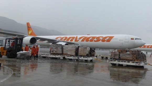 Aisladores poliméricos, pararrayos, alicates, herrajes y cortacorrientes, además de un centenar de motosierras, entre otros medios y materiales, conforman la carga solidaria transportada por un avión A340-600, de la aerolínea Conviasa.